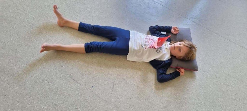 Auch Traumreisen und Entspannung gehörten dazu. Hier wurde Atem sichtbar gemacht. Durch das Ein- und Ausatmen bewegt sich der Brustkorb und das selbst gebastelte Schiffchen hebt und senkt sich. Die rote Fahne flattert beim Ausatmen.